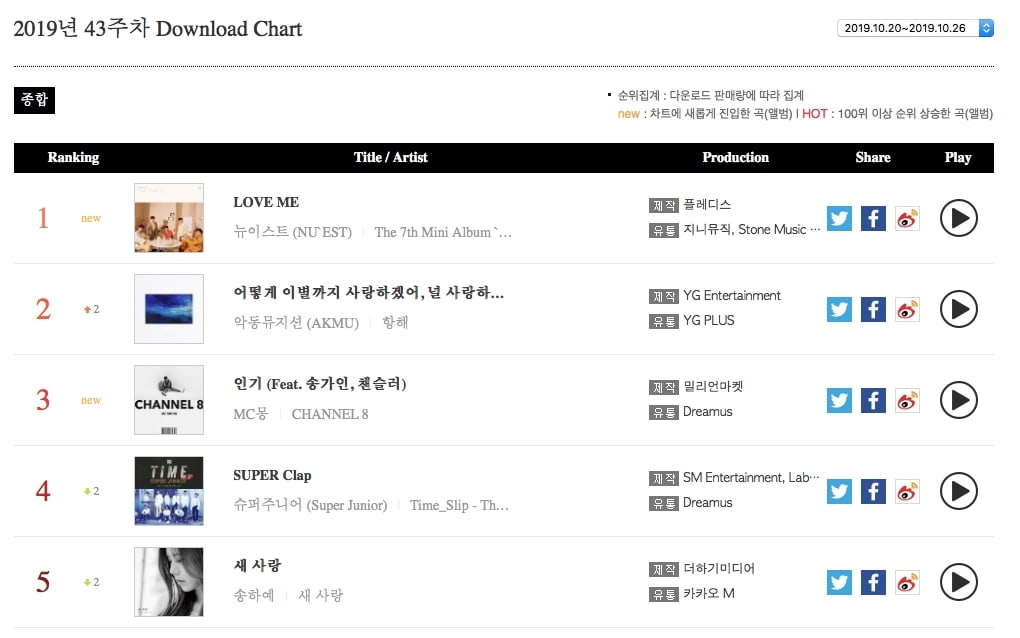 Ca khúc chủ đề mới LOVE ME của NU'EST đã được ra mắt ở vị trí số 1 trên bảng xếp này. Tiếp theo là How Can I Love the Heartbreak, You’re the One I Love của AKMU. Fame của MC Mong đứng hạng 3. Super Clap của nhóm Super Junior và ca khúc Another Love của Song Ha Ye lần lượt đứng hạng 4 và 5.