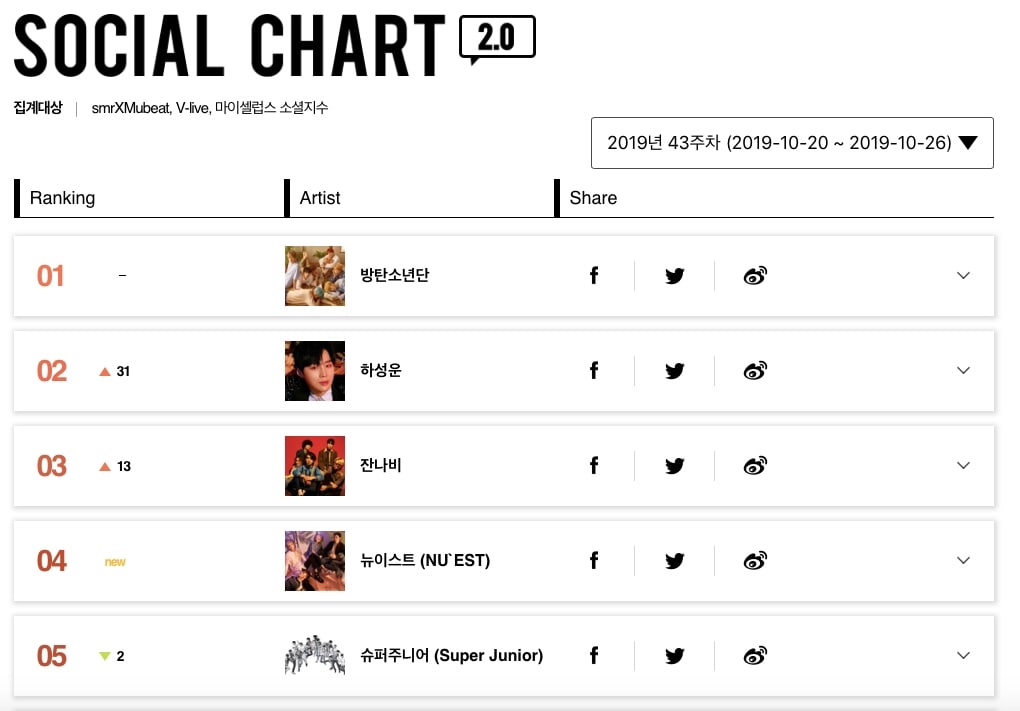BTS đứng đầu bảng xếp hạng xã hội trong 17 tuần liên tiếp. Ha Sung Woon và Jannabi lần lượt đứng hạng 2 - 3. Nhóm NU'EST và Super Junior đứng hạng 4 và 5.