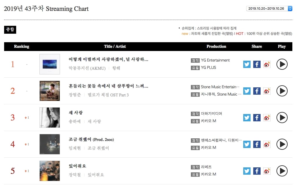 How Can I Love the Heartbreak, You’re the One I Love của AKMU đã duy trì thành công thứ hạng cao nhất, đứng đầy cả bảng xếp hạng kỹ thuật số tổng thể và biểu đồ phát trực tuyến trong 4 tuần liên tiếp.