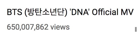 BTS chính thức ghi dấu mốc lịch sử trong hành trình âm nhạc của nhóm với MV đầu tiên của giới thần tượng nam Hàn Quốc đạt con số 650 triệu view trên Youtube. Thành tích này thuộc về MV DNA.
