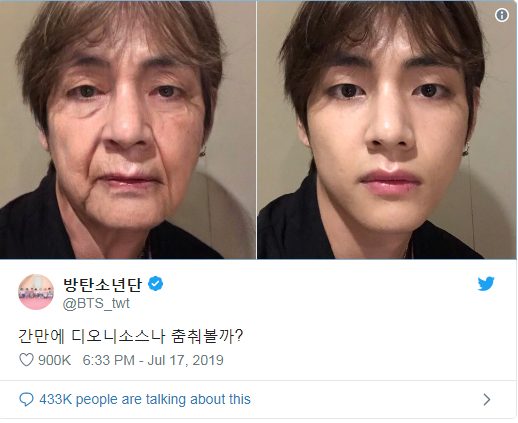 Mở màn cho thử thách này là V (BTS) khi anh chàng tự dìm bản thân bằng cách post tấm ảnh già nua của mình lên Twitter chính thức của BTS kèm theo caption hài hước: “Cũng đã lâu lắm rồi, mình có nên nhảy Dionysus”. Các ARMY đều đồng ý với anh chàng, dù trẻ tuổi hay già nua các fan đều ủng hộ những màn trình diễn của các anh chàng.