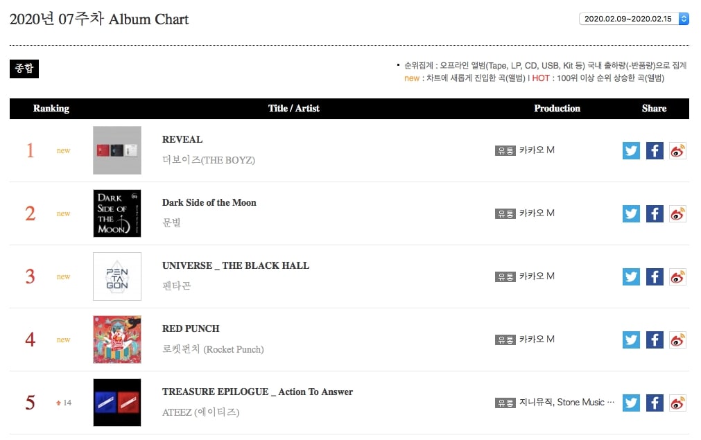 Nhiều bản phát hành mới thống trị bảng xếp hạng album tuần này. Trong đó, album phòng thu đầu tiên Reveal của The Boyz, đứng ở vị trí số 1. Album solo thứ hai Dark Side of the Moon của Moonbyul (MAMAMOO) đứng hạng 2. Tiếp đến, Universe: The Black Hall của nhóm PENTAGON và Red Punch của Rocket Punch lần lượt xếp hạng 3 - 4. Cuối cùng, album mini mới nhất TREASURE EPILOGUE : Action To Answer của ATEEZ đã quay trở lại bảng xếp hạng để lọt vào top năm trong tuần.