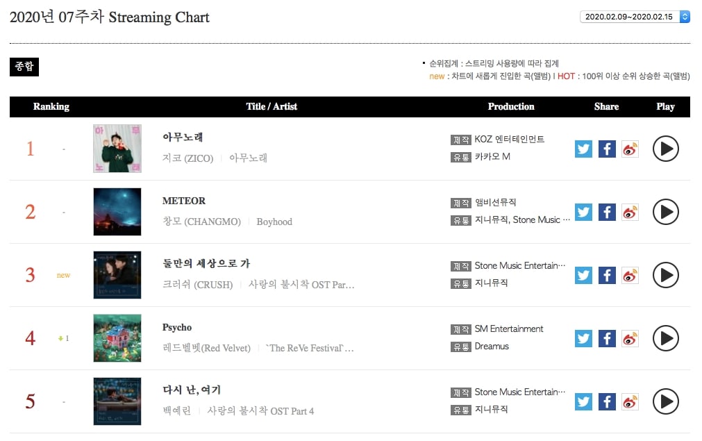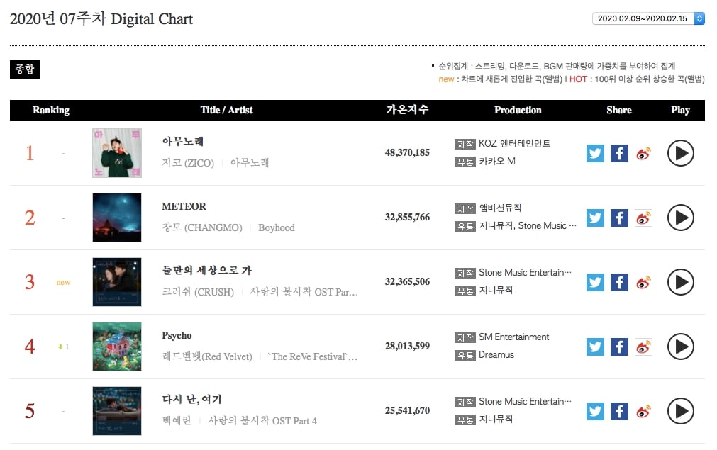 Năm bài hát hàng đầu trên bảng xếp hạng kỹ thuật số tổng thể và bảng xếp hạng phát trực tuyến hoàn toàn giống nhau trong tuần này. Any Song của Zico (Block B) đứng nhất năm tuần liên tiếp. Trong khi, METEOR của Changmo vẫn duy trì vị trí của mình ở hạng 2. Ca khúc Let Us Go (nhạc phim Hạ cánh nơi anh đài tvN) của Crush ra mắt ở vị trí thứ 3 trên cả hai bảng xếp hạng. Tiếp đến, Psycho của Red Velvet ở vị trí thứ 4 và ca khúc Here I Am Again (nhạc phim Hạ cánh nơi anh) của Baek Yerin ở hạng 5.