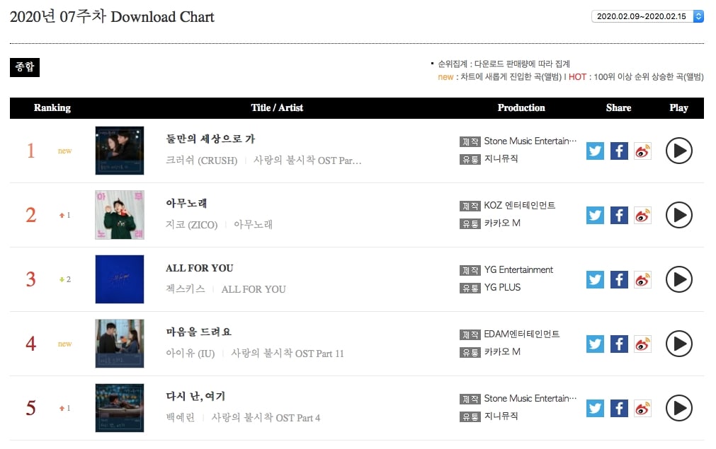 Let Us Go của Crush ra mắt ở vị trí Quán quân trên bảng xếp hạng tuần này. Hạng 2 thuộc về Any Song của Zico. Ca khúc ALL FOR YOU của nhóm nhạc huyền thoại SECHSKIES đứng vị trí thứ 3. Tiếp đến, ca khúc I Give You My Heart (nhạc phim Hạ cánh nơi anh) của IU ra mắt ở hạng 4 và Here I Am Again của Baek Yerin ở vị trí thứ 5.