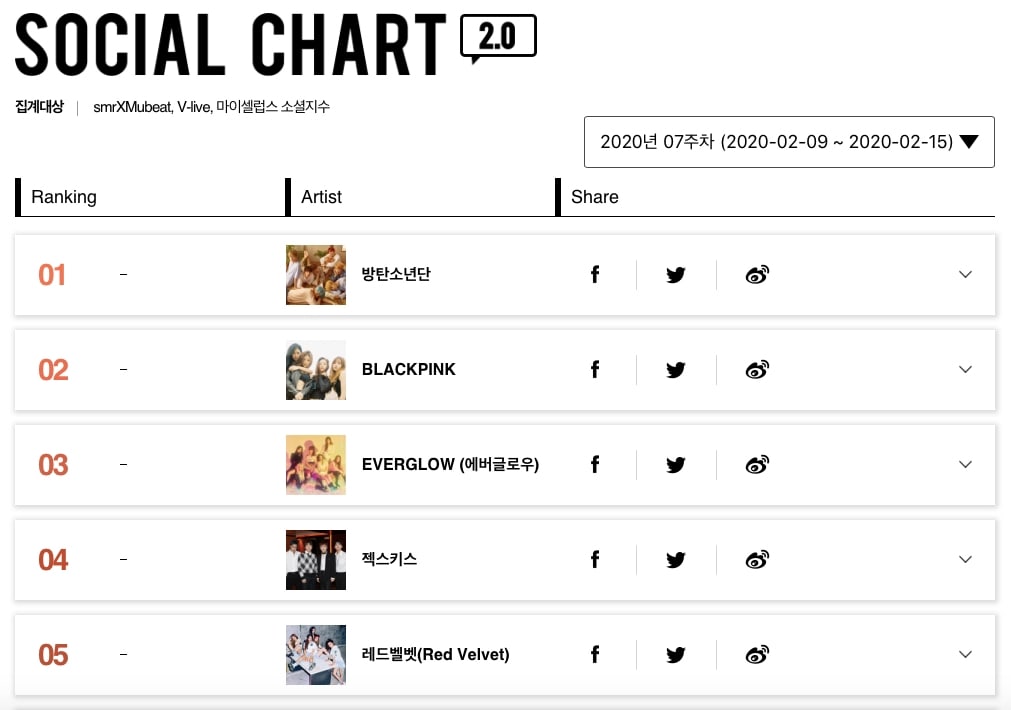 BTS tiếp tục ngự trị ở vị trí số 1 trên Bảng xếp hạng xã hội Gaon 2.0 trong tuần này. Nhóm nhạc ở hạng 2 thuộc về BLACKPINK. Nhóm EVERGLOW, SECHSKIES và Red Velvet lần lượt theo sau.