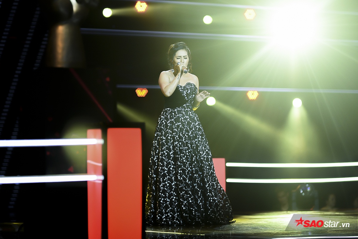 Thái Bình với chất giọng mỏng, nhẹ, cao cùng thần thái quyến rũ luôn uyển chuyển trên sân khấu như viên ngọc sáng lộng lẫy của team HLV Tóc Tiên.