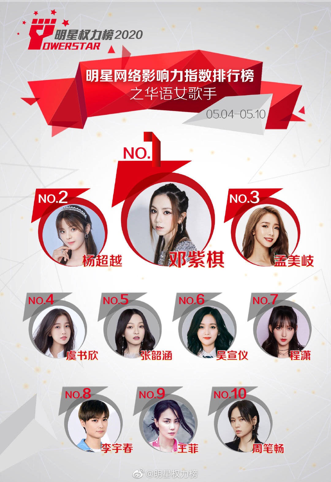 Vào ngày 16/05 vừa qua, Powerstar đã tiết lộ xếp hạng cho những ngôi sao châu Á, người sở hữu chỉ số ảnh hưởng lớn nhất đến công chúng từ ngày 04/05 đến ngày 10/05. Kết quả dựa trên thống kê tương tác, bình chọn từ các phiếu bầu của cư dân mạng, người hâm mộ về độ nổi tiếng và sức ảnh hưởng của các ca sĩ thần tượng trên mạng xã hội Weibo ở Trung Quốc trong một tuần. Theo đó, xếp hạng cuối được công chúng yêu thích nhất như sau: