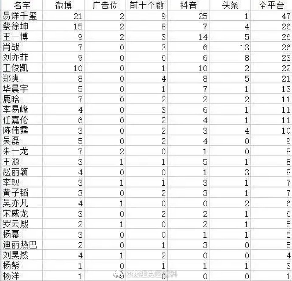 Nhân khí ngày càng tăng, thêm vào việc các phim truyền hình, điện ảnh được yêu thích, số lần tham dự sự kiện của Dịch Dương Thiên Tỉ vô cùng nhiều thì tương đương xác suất lên hot-search rất cao. Dịch Dương Thiên Tỉ xếp thứ nhất trong bảng xếp hạng tháng 3 này với tổng 47 lần trên toàn mạng xã hội (gồm Weibo, Tiktok, Đầu điều…).