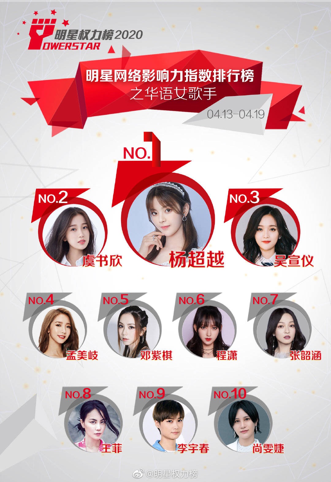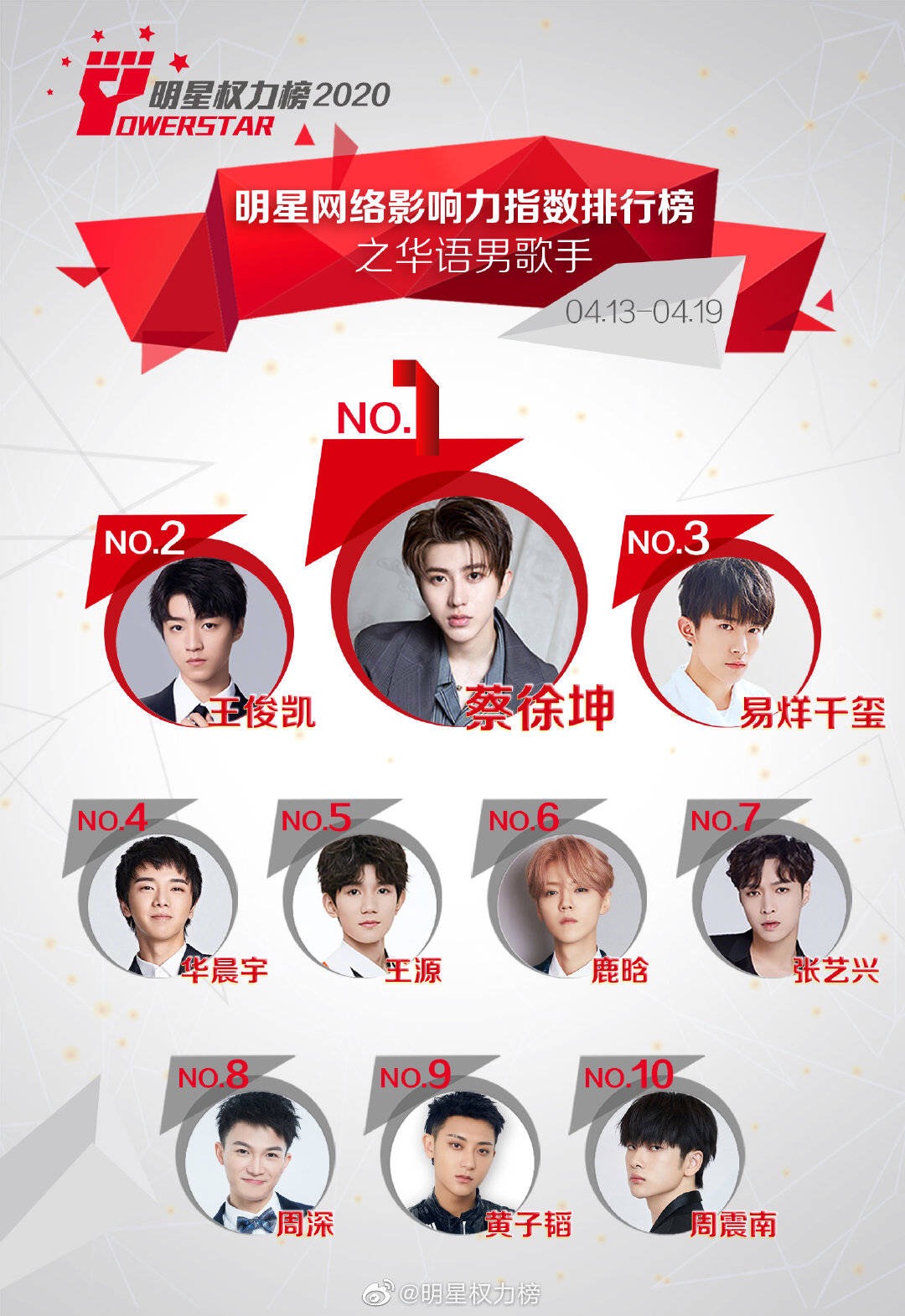 Vào ngày 24/04, Powerstar đã tiết lộ xếp hạng cho những ngôi sao châu Á, người sở hữu chỉ số ảnh hưởng lớn nhất đến công chúng từ ngày 13/04 đến ngày 19/04. Kết quả dựa trên thống kê tương tác, bình chọn từ các phiếu bầu của cư dân mạng, người hâm mộ về độ nổi tiếng và sức ảnh hưởng của các ca sĩ trên mạng xã hội Weibo ở Trung Quốc trong một tuần. Theo đó, xếp hạng cuối được công chúng yêu thích nhất như sau: