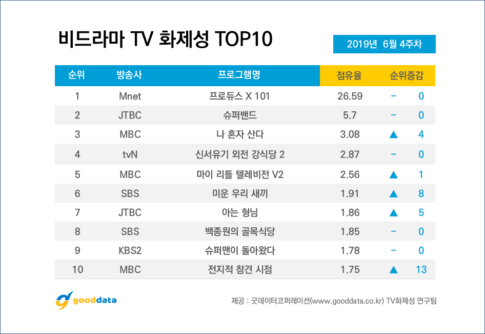 Vào ngày 02/07, Good Data Corporation đã công bố bảng xếp hạng các chương trình truyền hình và nghệ sĩ gây được nhiều tiếng vang, thu hút được sự chú ý từ công chúng từ ngày 24/06 đến ngày 30/06.