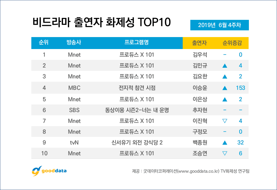 Chương trình Produce X 101 đài Mnet đứng đầu danh sách các chương trình truyền hình hot nhất trong 9 tuần liên tiếp, chiếm 26,59% tổng số ảnh hưởng và nổi tiếng trong bảng xếp hạng. Theo đó, các thực tập sinh của Produce X 101 tiếp tục thống trị bảng xếp hạng của các ngôi sao nổi tiếng nhất. Như báo cáo, Kim Woo Seok chiếm hạng nhất trong 4 tuần liên tiếp. Theo sau thuộc về Kim Min Kyu, Kim Yo Han, Lee Eun Sang, Lee Jin Hyuk, Goo Jung Mo và Cho Seung Yeon.