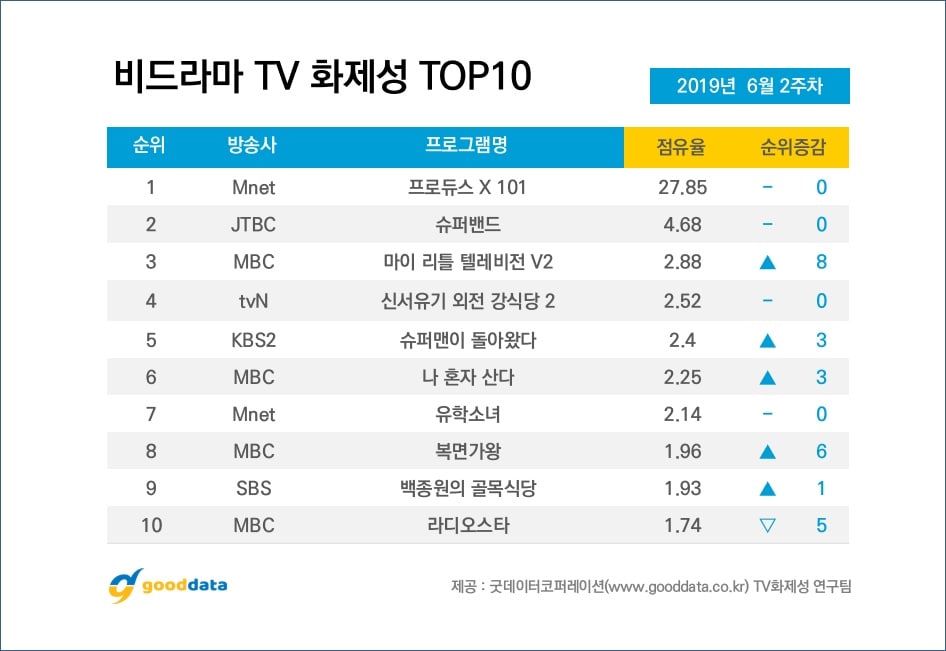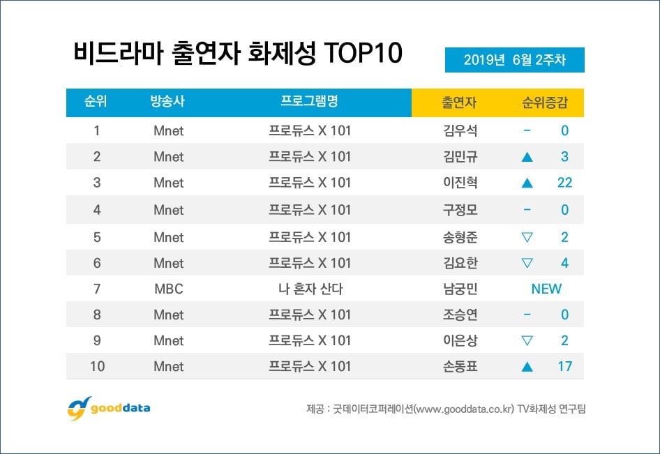 Chương trình Produce X 101 đài Mnet đứng đầu danh sách các chương trình truyền hình đáng chú ý nhất trong tuần thứ bảy liên tiếp, chiếm 27,85 % tổng số chỉ số nổi tiếng.