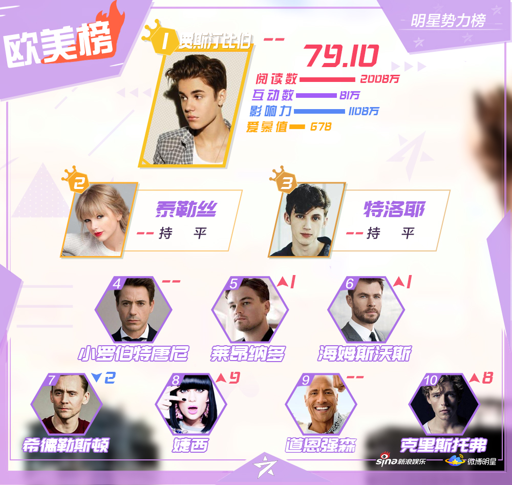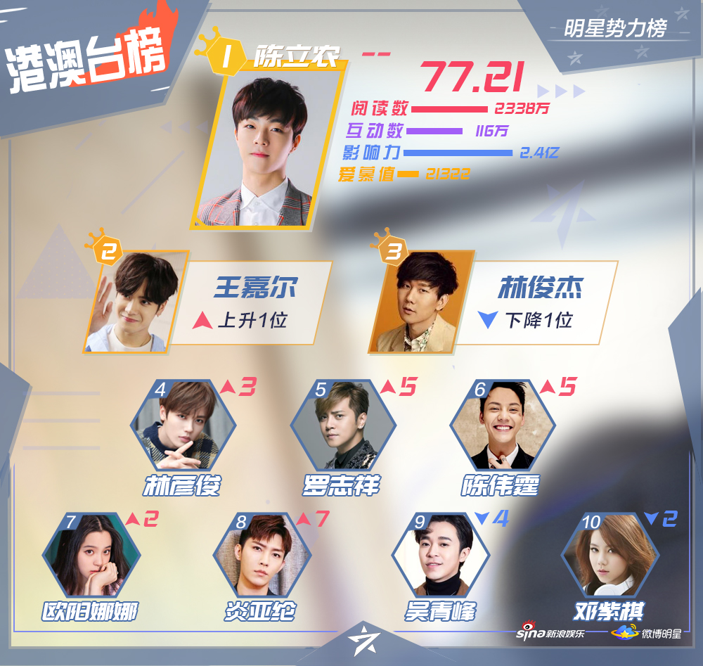 Mới đây, Sina Entertainment đã công bố top 10 những nghệ sĩ nổi tiếng, đang hoạt động ở khu vực Đại Lục Trung Quốc, Hong Kong, Macao - Đài Loan, các quốc gia châu Á - Thái Bình Dương và châu Âu - Hoa Kỳ trên mạng xã hội Weibo.