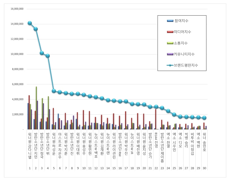 Mới đây, Viện nghiên cứu kinh doanh Hàn Quốc vừa công bố top 30 nam idol có giá trị thương hiệu cao nhất tháng 12. Thống kê được tính từ ngày 14/11 -15/12 với 476 thành viên nhóm nhạc nam thông qua các chỉ số phủ sóng truyền thông, quảng cáo, nhận thức cộng đồng và người tiêu dùng,…