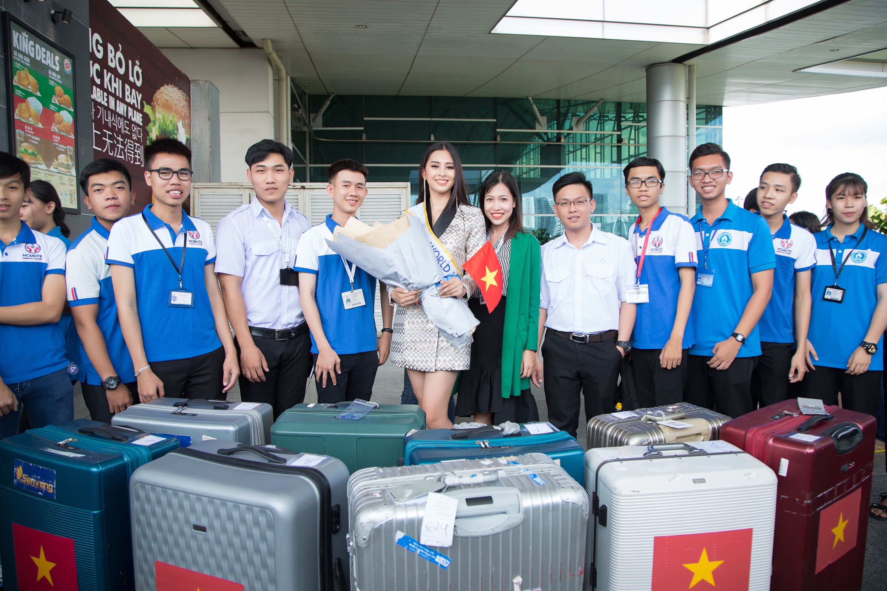 Đến tiễn và động viên Tiểu Vy bên cạnh ê-kíp còn có mẹ hoa hậu và thầy cô của trường Đại học Sư phạm Kỹ thuật TP. HCM - nơi cô nàng đang theo học. Bên cạnh đó, đông đảo sinh viên là bạn học cũng như fan của Tiểu Vy cũng có mặt để đồng lòng chúc Tiểu Vy may mắn. Vẫn vẻ đẹp sắc sảo, tươi tắn nhưng đương kim Hoa hậu Việt Nam không giấu được sự xúc động khi chia tay người thân lên đường sang Trung Quốc tham gia Miss World.