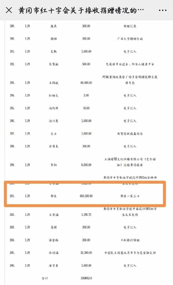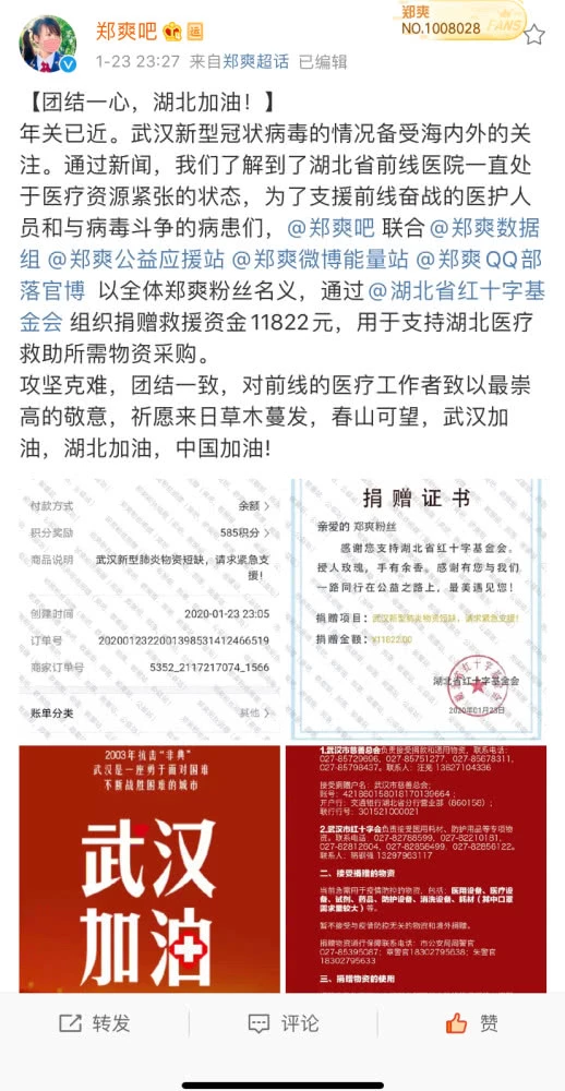 Ngày 29 tháng 1, theo như tin tức được công bố chính thức từ hội chữ thập đỏ Hoàng Cương cho biết, cả nhà Trịnh Sảng đã quyên góp 600 ngàn NDT (hơn 2 tỷ đồng) cho chữ thập đỏ Hoàng Cương, dùng để ủng hộ công tác phòng dịch của tỉnh Hồ Bắc.