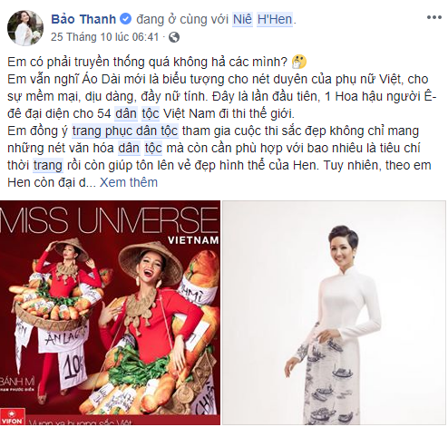 Diễn viên Minh Vân của Sống chung với mẹ chồng cũng ra tay ủng hộ H'Hen Niê trong cuộc chiến lần này. Theo cô, ở đâu đó, Áo Dài vẫn là biểu tượng cho nét duyên của phụ nữ Việt và đủ sức mạnh để chuyên chở tinh hoa dân tộc Việt. Bảo Thanh chia sẻ: “Vậy nên em tin tưởng Niê H'Hen sẽ giúp hương sắc Việt vươn xa, để lại ấn tượng tốt đẹp cho bạn bè các nước. Với em, em chỉ mong H’Hen Niê sẽ mặc lên người trang phục dân tộc được thiết kế và chắt lọc văn hóa tinh tế nhất thôi“.