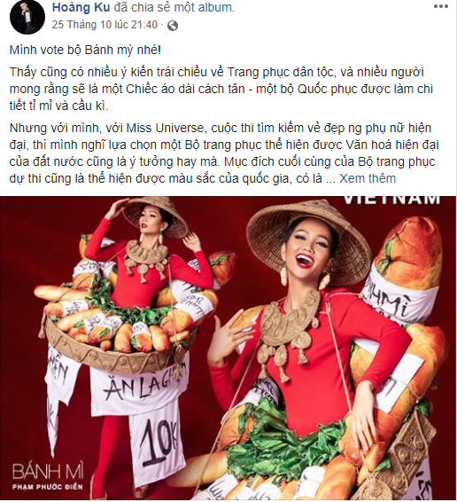 Nổi tiếng với vai trò đi phù phép cho các người đẹp, định hình phong cách cho các mỹ nữ trong showbiz. Hoàng Ku bày tỏ quan điểm cá nhân khi đưa ra quyết định lựa chọn ‘Bánh mì’ là trang phục dân tộc mà anh yêu thích nhất.