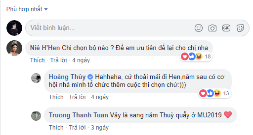 Hai nàng hậu tâm đầu ý hợp khi Hen cho rằng sẽ ưu tiên để lại một bộ cho Hoàng Thùy mặc vào năm 2019. Hậu đăng quang, cả H'Hen Niê và Hoàng Thùy giữ cho nhau một tình bạn đẹp và thường xuyên xuất hiện trong cùng sự kiện và các buổi chụp hình.