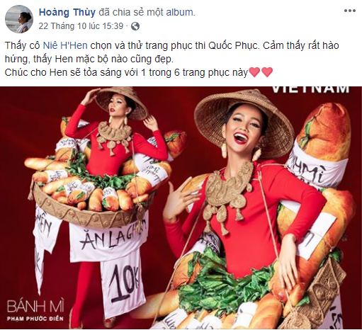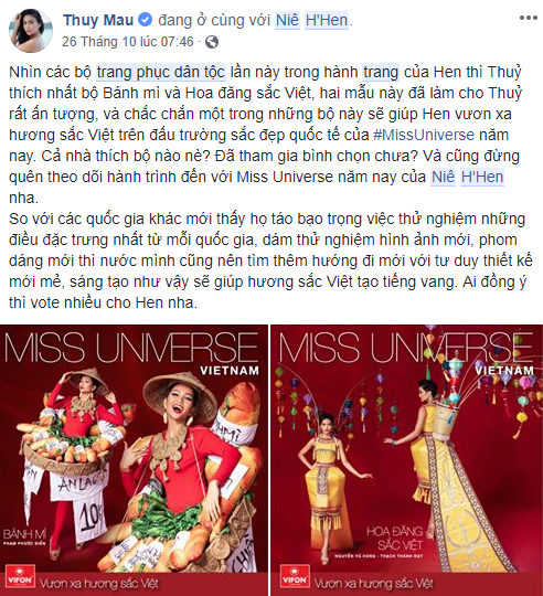 Bít cửa Big 6 cuộc thi nhan sắc 2018, đồng nghĩa với việc khán giả sẽ không nhìn thấy Thủy sải bước trên đấu trường quốc tế năm nay. Riêng về việc lựa chọn trang phục dân tộc cho bạn cùng chiến vào năm trước, Mâu Thủy ấn tượng với Bánh Mỳ và Hoa đăng sắc Việt và chia sẻ trên trang cá nhân của mình: “Chắc chắn một trong những bộ này sẽ giúp Hen vươn xa hương sắc Việt trên đấu trường sắc đẹp quốc tế”, cô cũng không quên nhắn gửi mọi người đừng quên theo dõi và ủng hộ hành trình Miss Universe 2018 của H'Hen Niê.