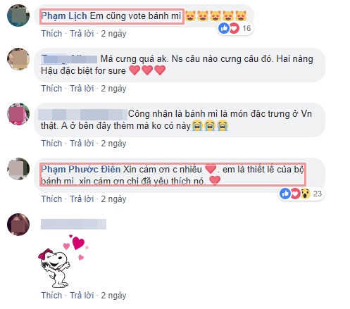 Hoa hậu chuyển giới quốc tế 2018 cho rằng điểm gặp gỡ của cô và H'Hen Niê chính là họ đều là những Hoa hậu đặc biệt và hãy làm những điều thật đặc biệt để gây ấn tượng với bạn bè quốc tế. Theo đó, biên đạo múa Phạm Lịch cũng ủng hộ tác phẩm Bánh Mì. Khoảnh khắc dòng trạng thái chia sẽ được cha đẻ của Bánh Mì bắt gặp và anh thầm cảm ơn vì đã ủng hộ thiết kế của mình.