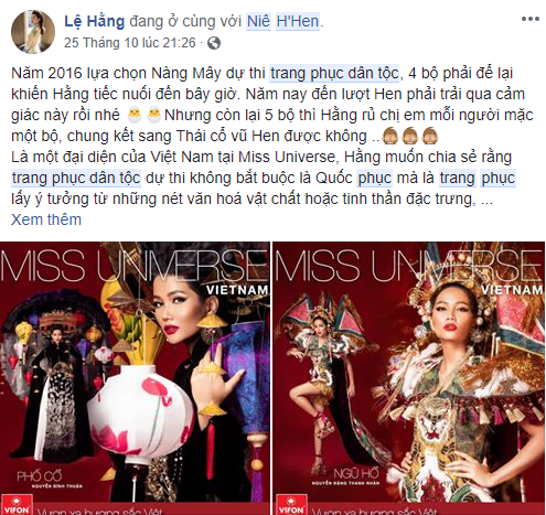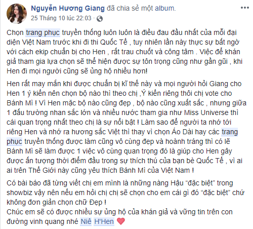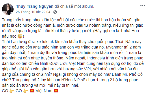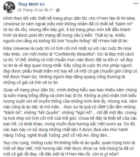 “Nhưng với mình, với Miss Universe, cuộc thi tìm kiếm vẻ đẹp phụ nữ hiện đại, thì mình nghĩ lựa chọn một Bộ trang phục thể hiện được văn hoá hiện đại của đất nước cũng là ý tưởng hay mà. Mục đích cuối cùng của Bộ trang phục dự thi cũng là thể hiện được màu sắc của quốc gia, có là truyền thống xa xưa hay văn hoá hiện đại thì cũng vẫn toả hương sắc Việt, đúng tinh thần và chủ đề mà“.