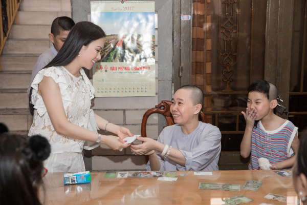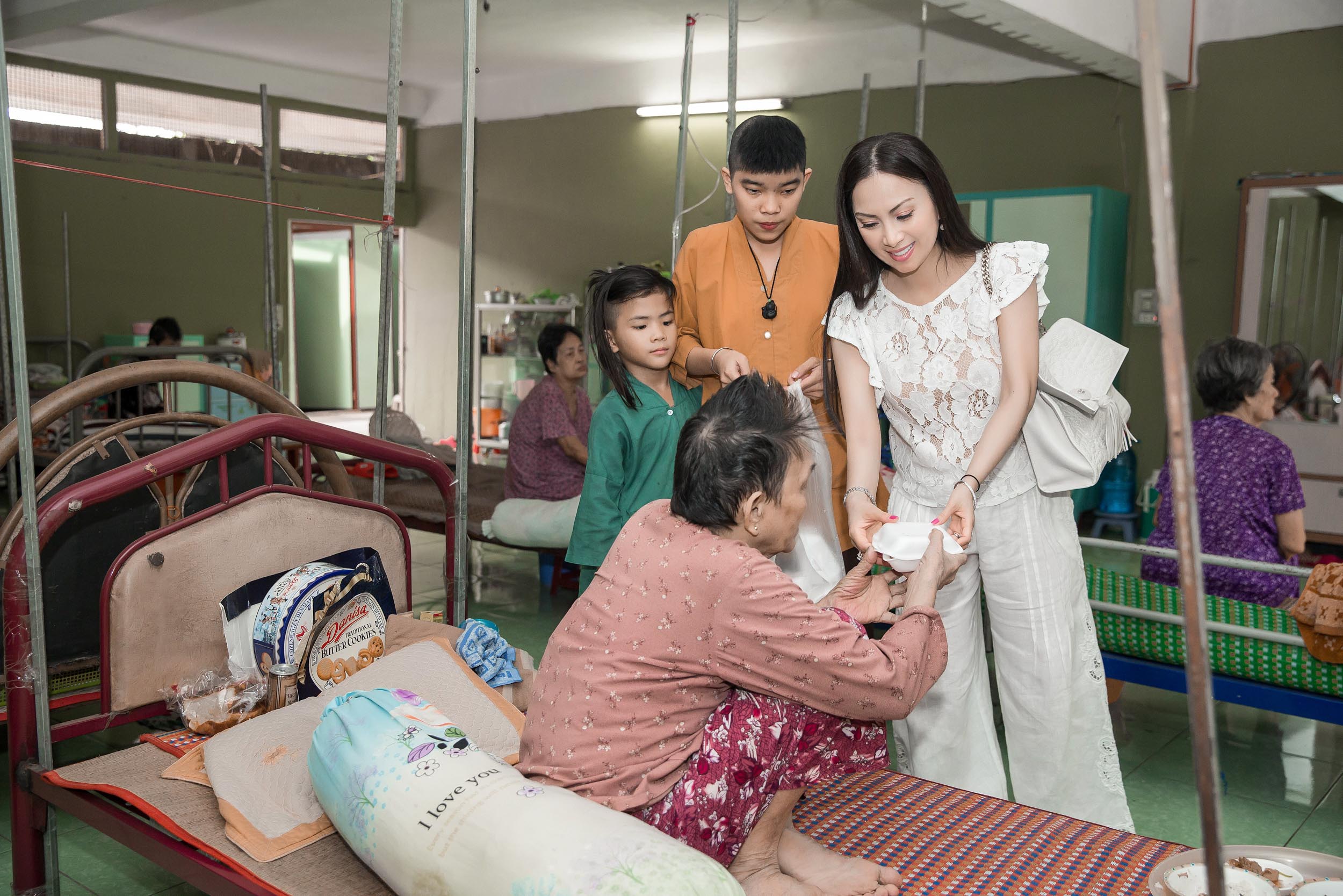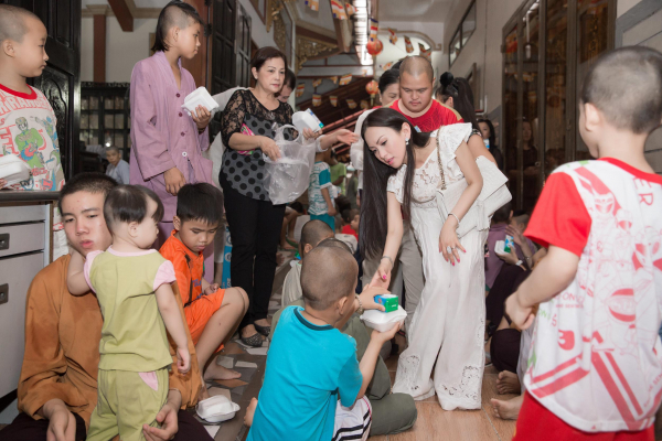 Vừa qua, Hà Phương có mặt tại chùa Từ Hạnh (quận Bình Tân, TP.HCM) cùng mẹ và hai con gái để đến thăm, tặng quà cho các cụ già, trẻ em cơ nhỡ không nơi nương tựa.