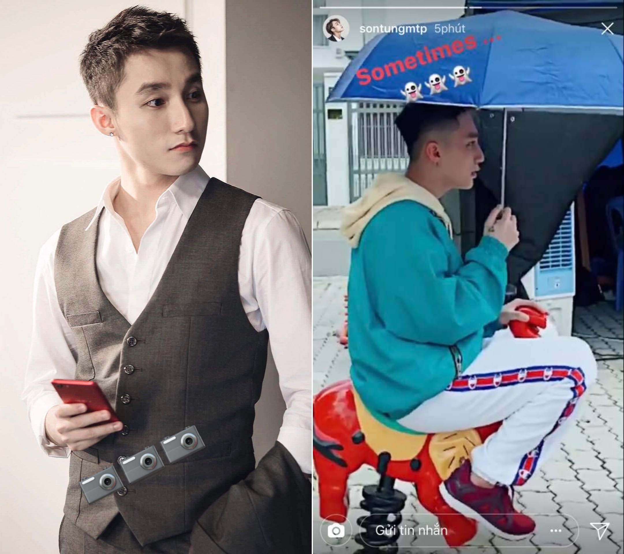 Vừa qua, trên Instagram Story, Sơn Tùng M-TP gây chú ý với hình ảnh mới nhất anh đăng tải. Theo đó, dù 23 tuổi nhưng giọng ca Lạc trôi vẫn hồn nhiên cầm ô, ngồi thú nhún lò xo cho trẻ em. Đặc biệt, hình ảnh đáng yêu này đối lập hoàn toàn với khoảnh khắc diện vest bảnh bao mà Sơn Tùng chia sẻ ngay ở Story trước, khiến fan không khỏi bật cười.