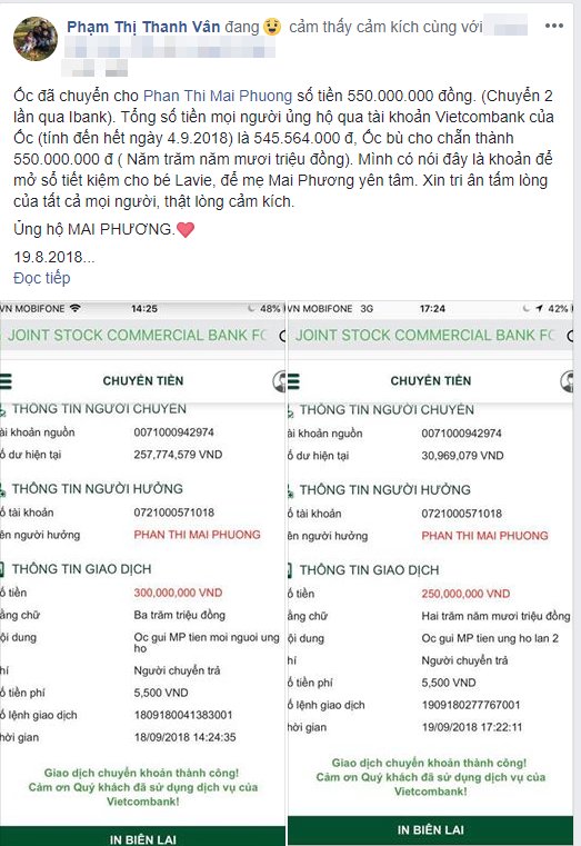 Mới đây, trên trang cá nhân của Ốc Thanh Vân đã đăng tải thông tin về việc, đã có nhiều người giúp đỡ Mai Phương để mở sổ tiết kiệm cho bé Lavie. Khoản tiền này giúp Mai Phương có thể yên tâm hơn về con gái khi cô đang chữa bệnh.