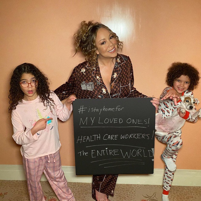 Mariah Carey chia sẻ bức ảnh chụp cùng 2 nhóc tì để hưởng ứng tham gia phong trào trên. Nữ ca sĩ chia sẻ rằng, cô sẽ ở nhà vì những nguòi mình yêu thương, vì các nhân viên y tế và vì thế giới.