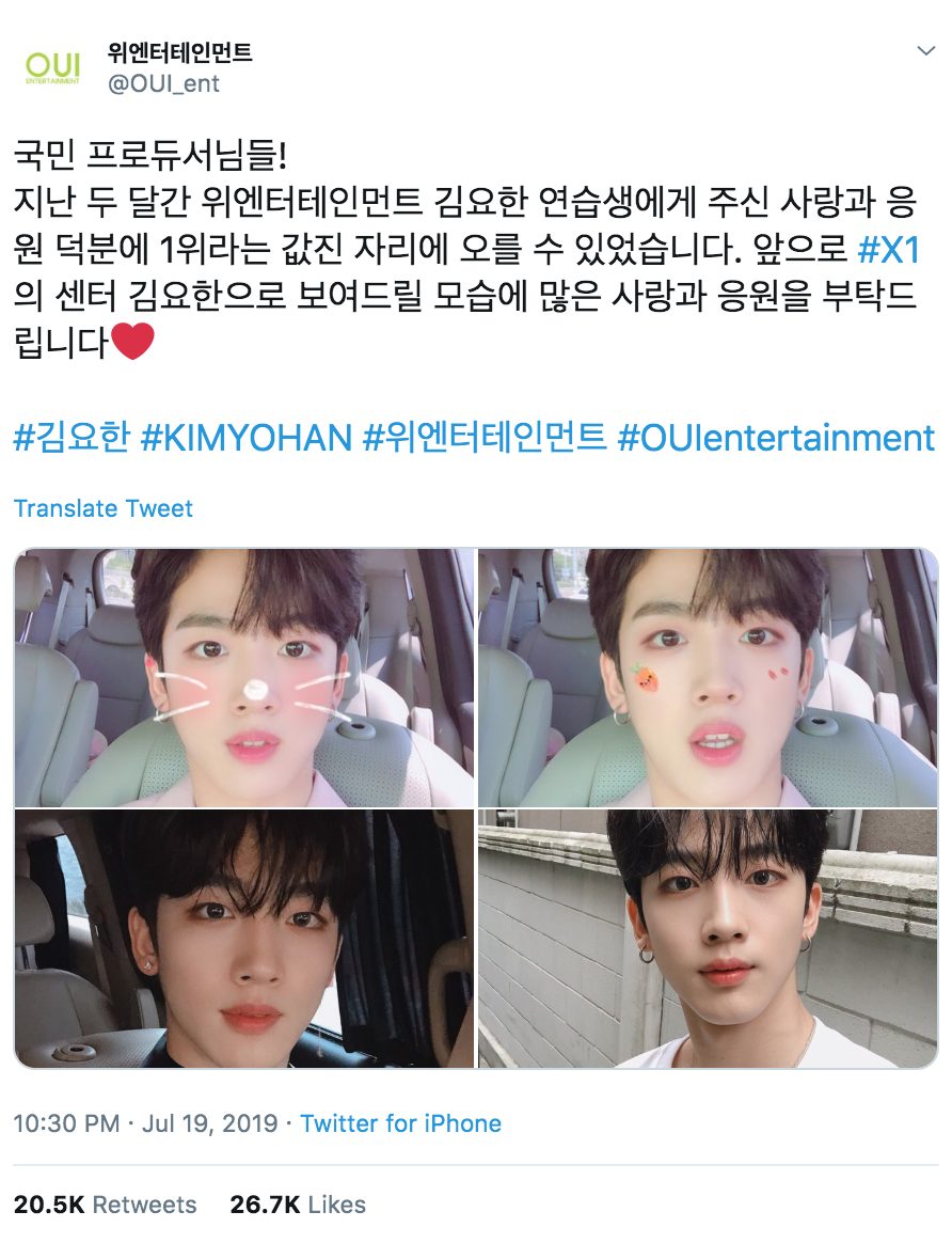 Mới đây, OUI Entertainment đã đăng tải hình ảnh tự sướng của người chiến thắng hạng nhất Kim Yo Han và gửi lời tri ân đến khán giả. “Nhờ tình yêu và sự ủng hộ của các bạn trong hai tháng qua, Yohan đã giành được vị trí đầu tiên. Hãy tiếp tục theo dõi và yêu thương anh ấy trong thời gian tới nhé, Kim Yo Han cố gắng hơn nữa trong tương lai“, công ty quản lý anh chàng chia sẻ.