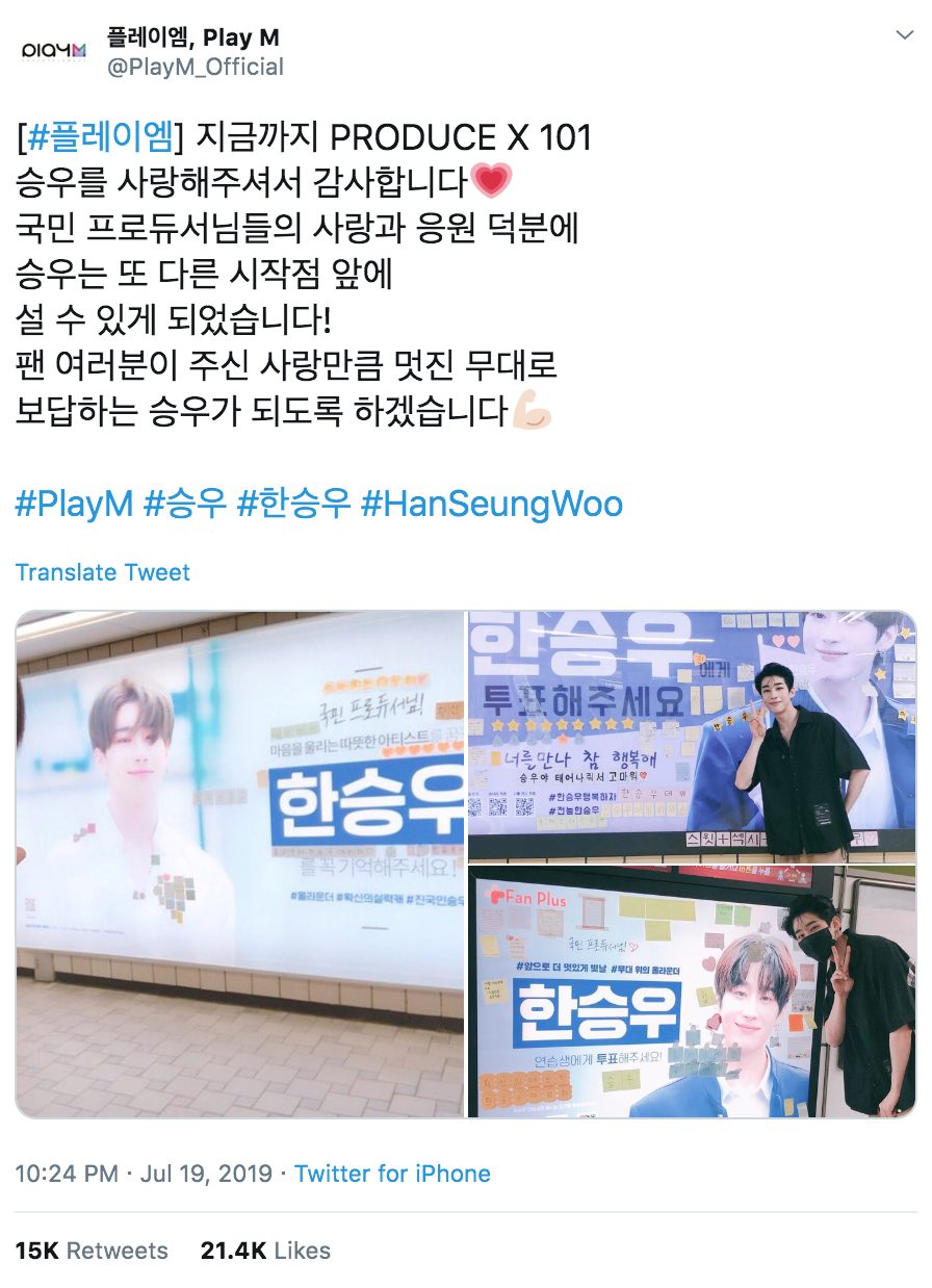 Play M Entertainment đã chia sẻ những bức ảnh của Han Seung Woo tạo dáng bên cạnh những poster của anh ấy trong các ga tàu điện ngầm đồng thời gửi lời cảm ơn đến người hâm mộ. “Nhờ tình yêu của khán giả, Seung Woo đã có thể tiến đến một khởi đầu mới. Anh ấy sẽ gửi đến các bạn những màn trình diễn tuyệt vời xứng đáng với tình yêu mà bạn đã dành cho anh ấy“.