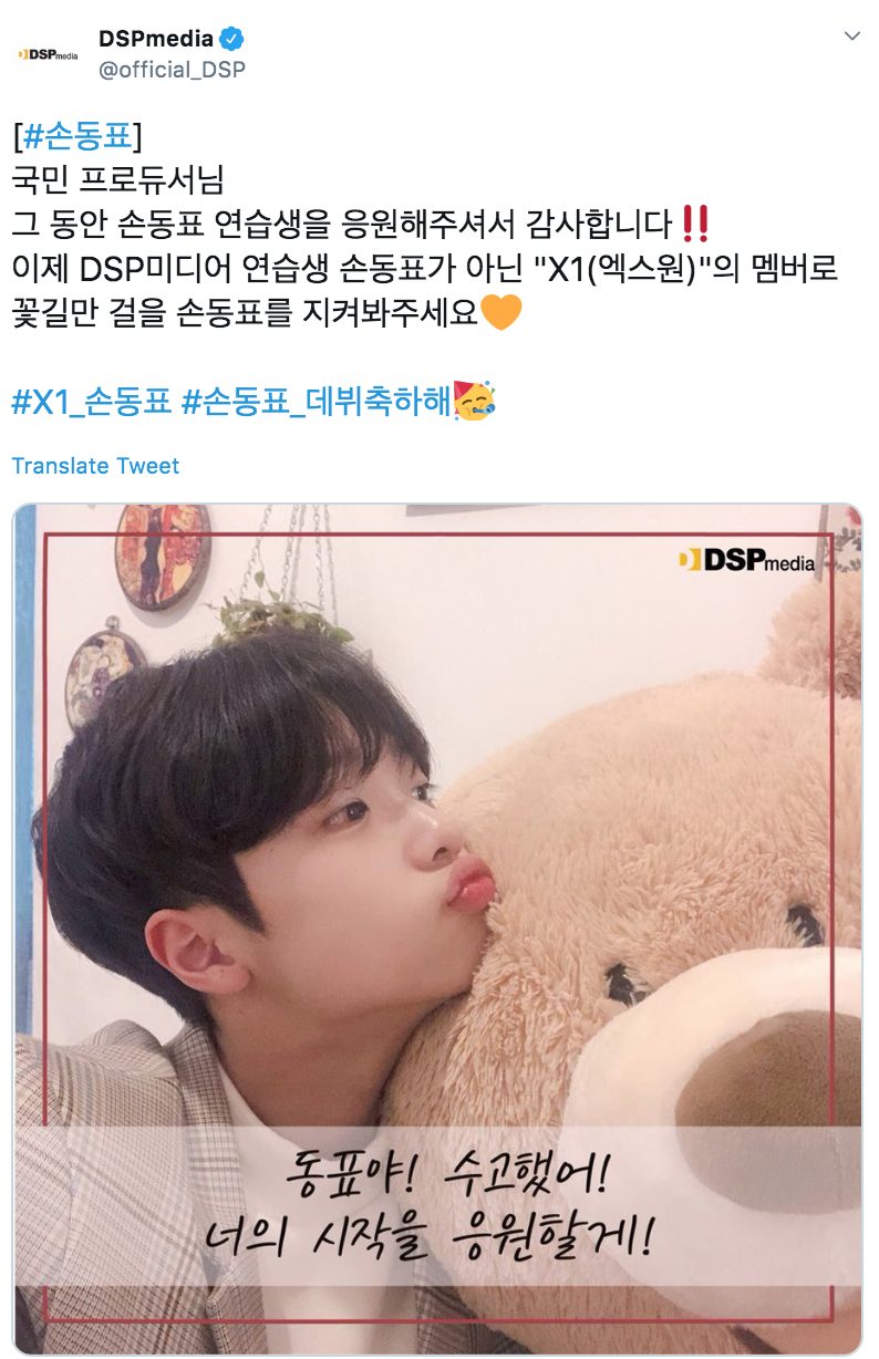 DSP Media cũng đã có những lời gửi đến người hâm mộ trên tài khoản Twitter của họ: “Cảm ơn bạn đã hỗ trợ thực tập sinh Son Dong Pyo hết mình. Xin hãy tiếp tục theo dõi anh ấy với tư cách là một thành viên của X1“.