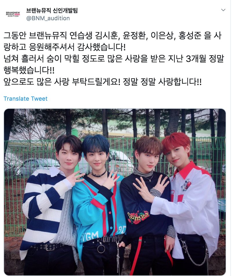 Là công ty có đến 4 thực tập sinh tại Produce X 101 năm nay, Brand New Music nhắn nhủ: “Cảm ơn các bạn đã yêu thương và ủng hộ các thực tập sinh Kim Si Hun, Yun Jung Hwan, Lee Eun Sang và Hong Seong Jun mọi lúc. Chúng tôi đã rất hạnh phúc trong ba tháng qua trong với tình yêu tràn ngập từ khán giả. Hãy tiếp tục yêu thương và theo dõi chúng tôi nhé, chúng tôi thực sự yêu các bạn“.