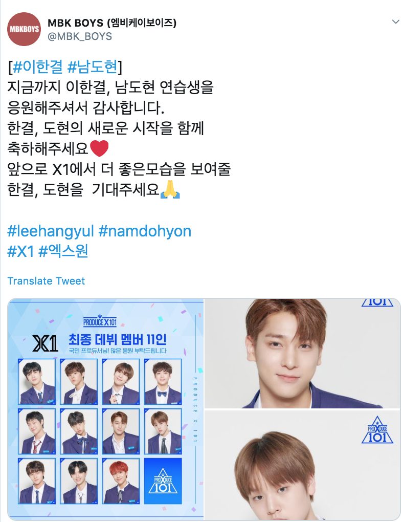 Có đến 2 thực tập sinh được ra mắt trong nhóm chiến thắng, MBK đã khá hào hứng và gửi lời cảm ơn đến tất cả khán giả. “Thật biết ơn các bạn đã ủng hộ các thực tập sinh Lee Han Gyul và Nam Do Hyon cho đến bây giờ. Xin hãy chờ đón sự phát triển của họ trong X1“.