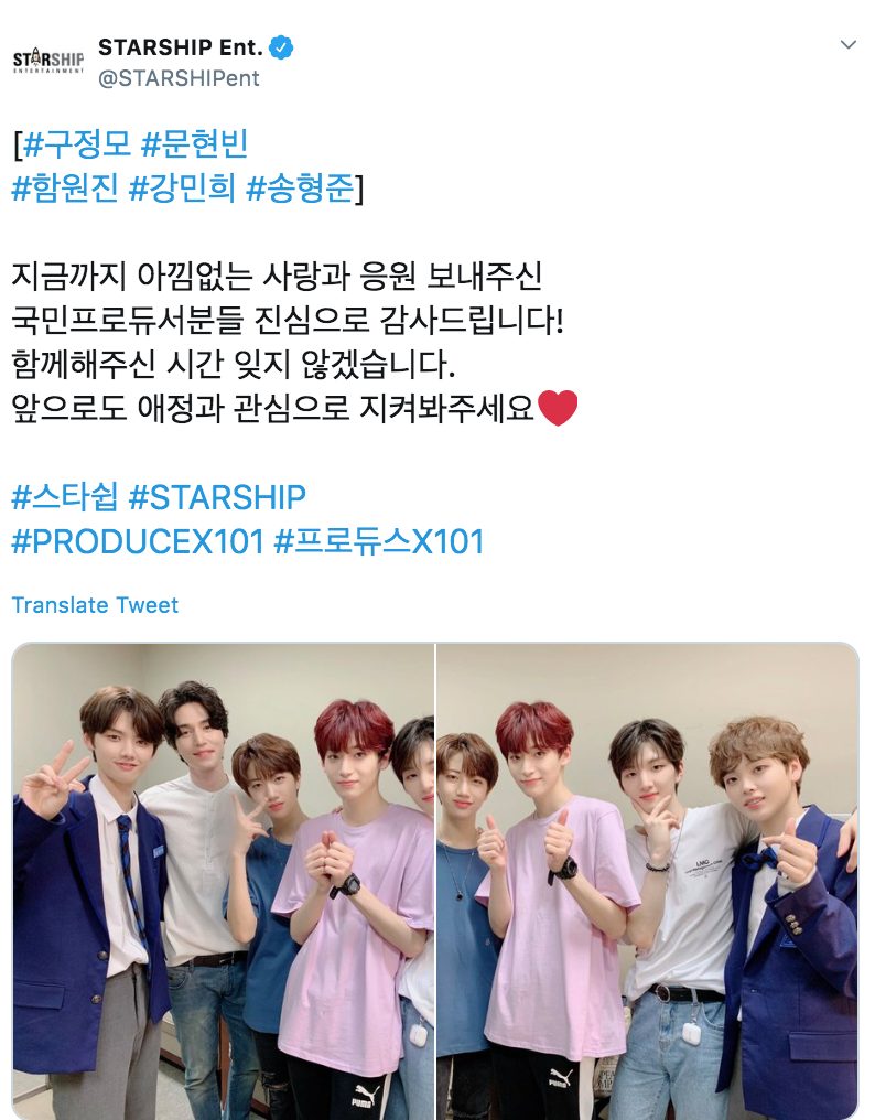 TOP Media đã gửi gắm lời cám ơn trên trang web chính thức của mình: “Đây là TOP Media. Cảm ơn các bạn đã cổ vũ và yêu mến các thực tập sinh Kim Woo Seok và Lee Jin Hyuk trong Produce X 101. Chúng tôi hứa sẽ làm hết sức mình để xứng đáng với tình yêu của các bạn dành cho Kim Woo Seok và Lee Jin Hyuk. Chúng tôi cũng sẽ hỗ trợ cho Kim Woo Seok và Lee Jin Hyuk hết mình để thể hiện những màn trình diễn tuyệt vời sau khi trở lại vị trí thực tập sinh“.