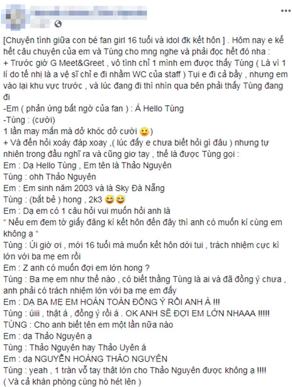 Tại buổi Meet&Greet diễn ra ở Đà Nẵng vừa qua, một trong những chi tiết khiến người hâm mộ đặc biệt quan tâm nhất có lẽ là việc Sơn Tùng M-TP đồng ý chờ một nữ sinh 2003 lớn lên để ký giấy đăng ký kết hôn.