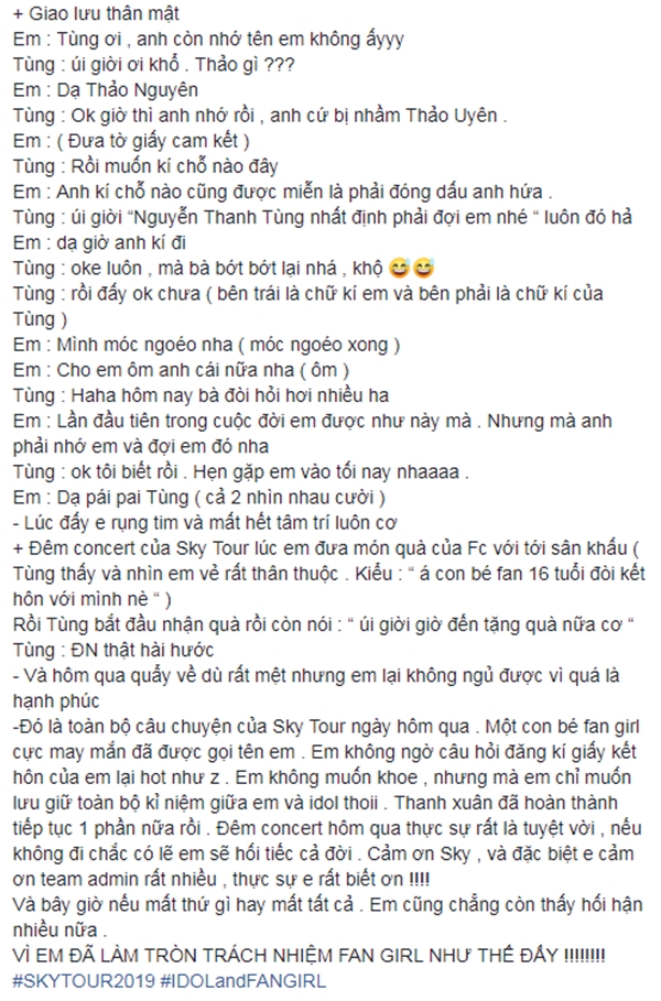 Mới đây, bạn Sky may mắn ấy đã tường thuật chi tiết khoảnh khắc đặc biệt đó trên trang cá nhân, đồng thời còn chụp lên cả mảnh giấy giọng hát Hãy trao cho anh ký giấy cam kết. Chia sẻ này nhanh chóng được cư dân mạng truyền tay vì quá đáng yêu!