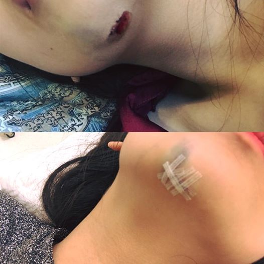 Cận cảnh chiếc cằm của Tú Anh trước và sau khi khâu vết thương.