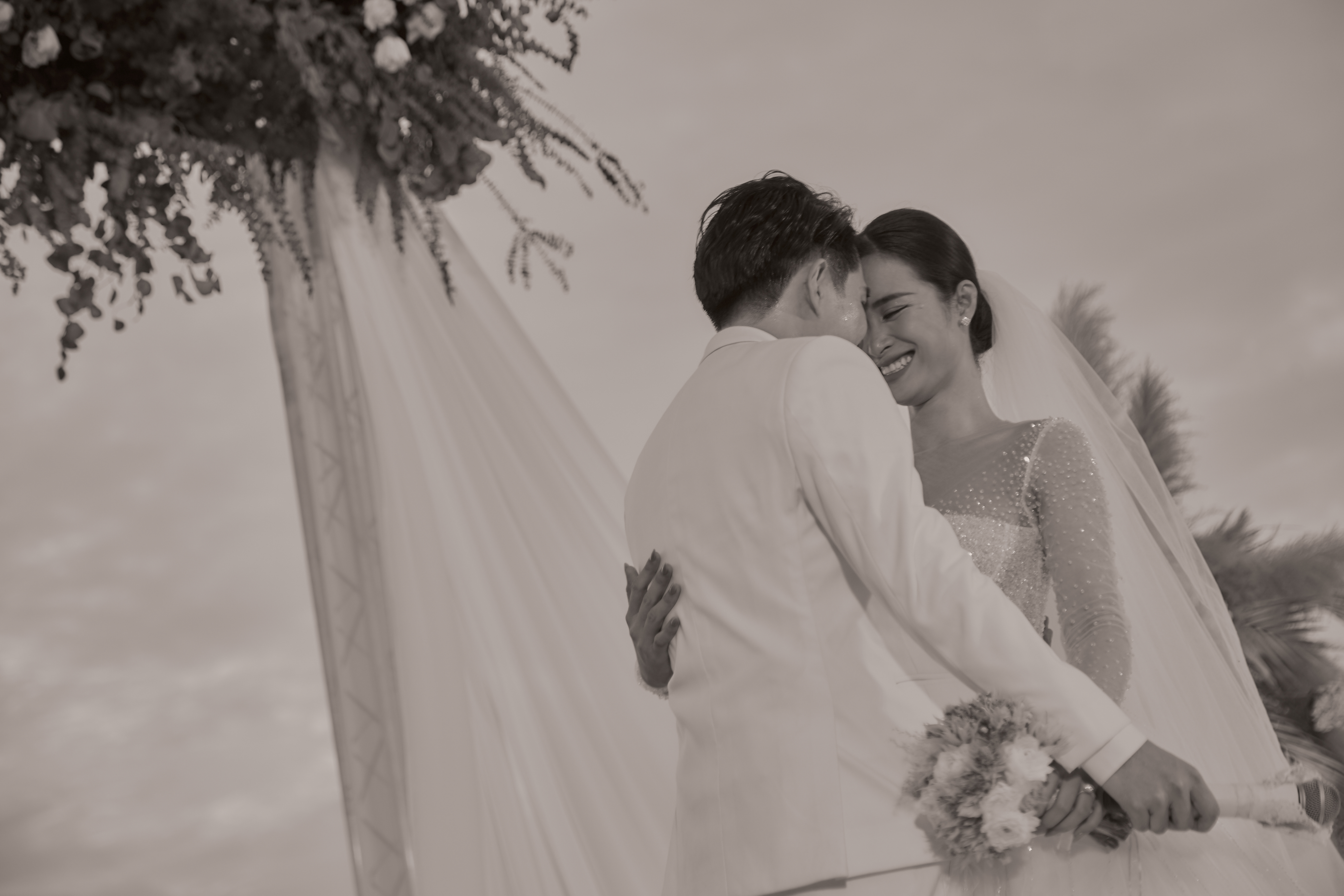 Ngay trên lễ đường sát biển vô cùng lãng mạn, vừa nắm được tay cô dâu, Ông Cao Thắng đã trao cho Đông Nhi một nụ hôn ngọt ngào. Đến với nhau 10 năm, đây không phải là nụ hôn đầu tiên nhưng chắc chắn đây là lần đầu cả 2 trao nhau 1 nụ hôn trước sự chứng kiến của rất nhiều người thân, bạn bè và đồng nghiệp.