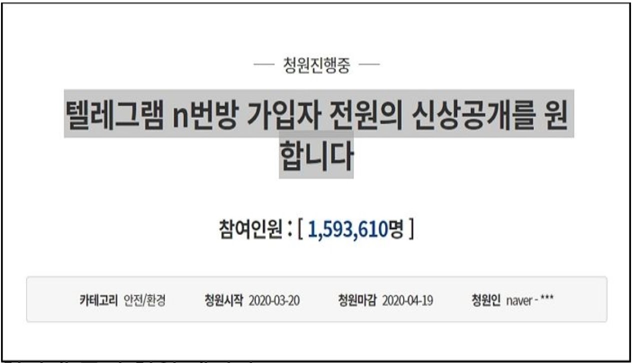 Đại diện cảnh sát Hàn Quốc: “Chúng tôi hợp tác với FBI và HSI để xem xét trụ sở của Telegram. Ngay khi tìm thấy trụ sở, chúng tôi sẽ sử dụng các phương pháp ngoại giao để yêu cầu sự hợp tác của họ”. Trước những tin tức gần đây, một kiến nghị quốc gia đã được huy động để yêu cầu tất cả những người liên quan đến phòng thứ N phải bị lộ danh tính và trừng phạt. Cho đến nay, bản kiến nghị đã đạt được hơn 1,5 triệu chữ ký.