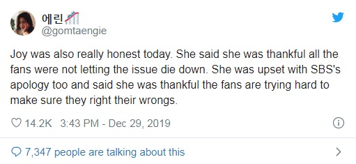 Trong buổi ký tặng fan của Red Velvet nhân dịp “Psycho” phát hành, Joy bày tỏ sự cảm kích đối với những fan hâm mộ đã đứng về phía Wendy, đòi hỏi SBS làm điều đúng đắn.