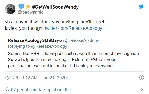 Chỉ vài ngày sau tai nạn của Wendy, SBS đã ra một thông báo, khẳng định rằng công ty đang thực hiện một cuộc điều tra nội bộ để xem tại sao sự cố không may kia lại xảy ra.
