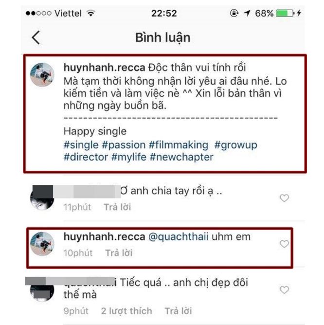 Thời gian gần đây, các fan cũng không còn thấy Huỳnh Anh và Hoàng Oanh đăng tải những hình ảnh bên nhau. Trước dòng chia sẻ của Huỳnh Anh, một khán giả đã hỏi: “Ơ, chia tay rồi ạ” và được chính Huỳnh Anh khẳng định chắc chắn cả hai đã “đường ai nấy đi”.