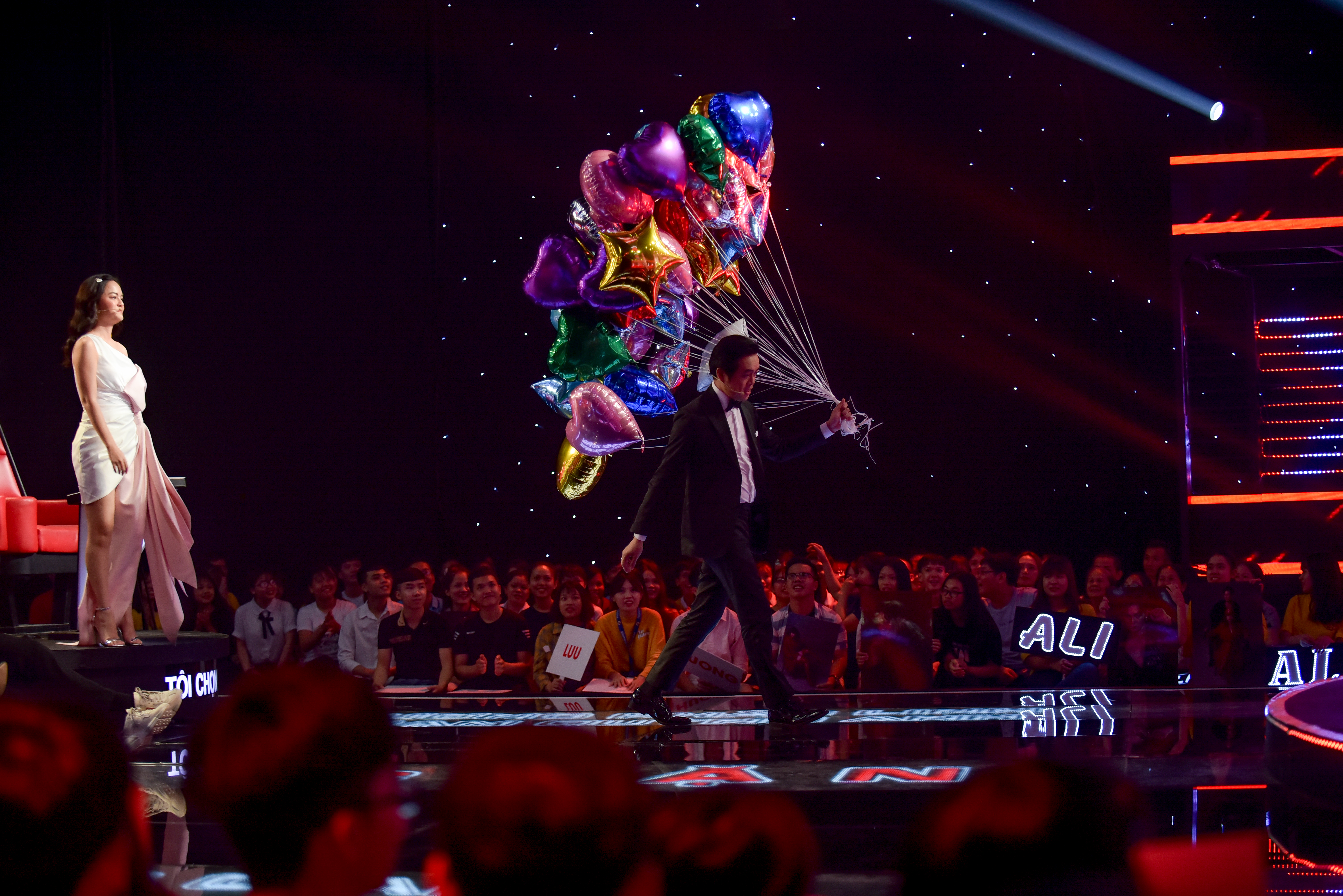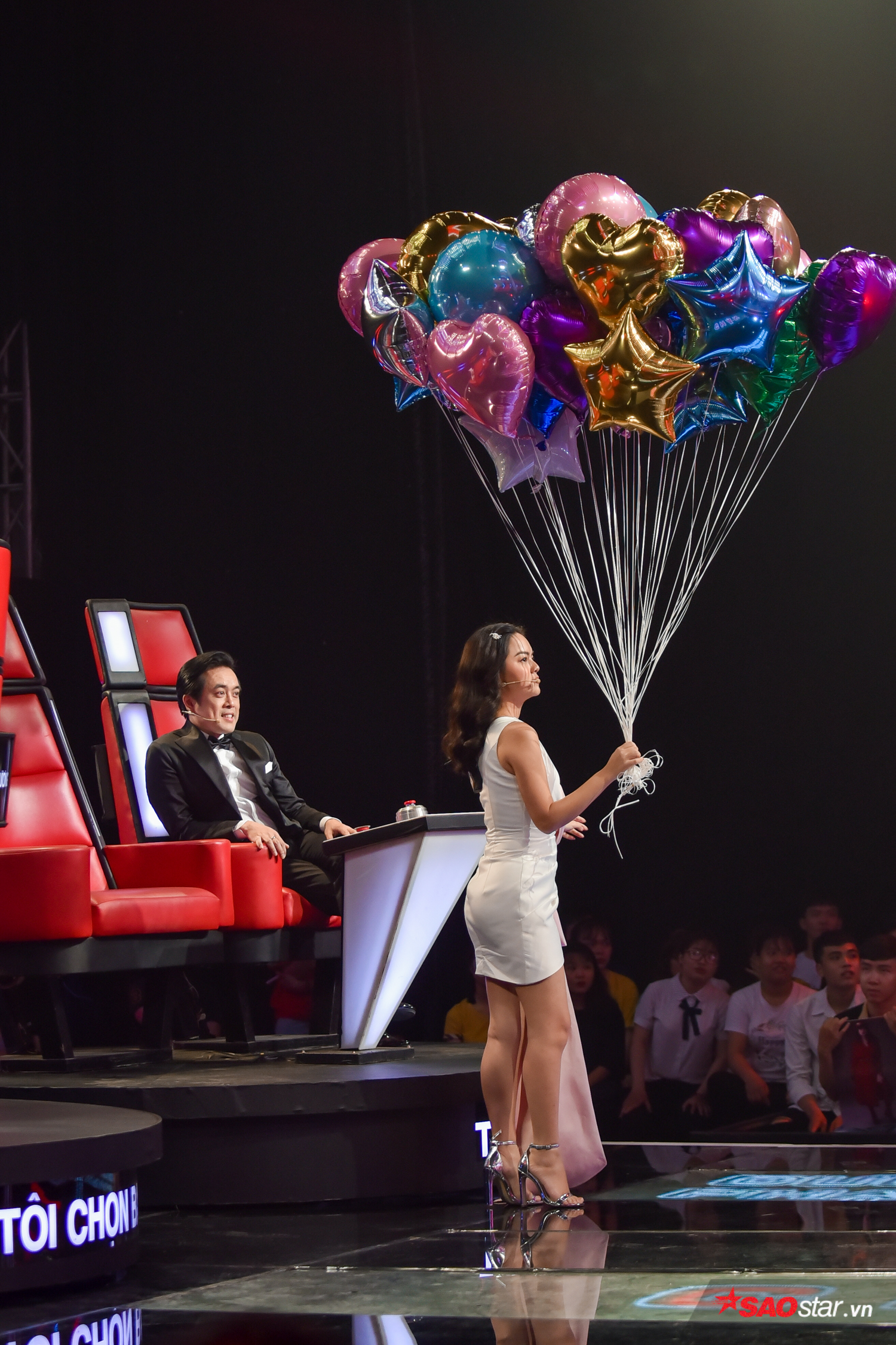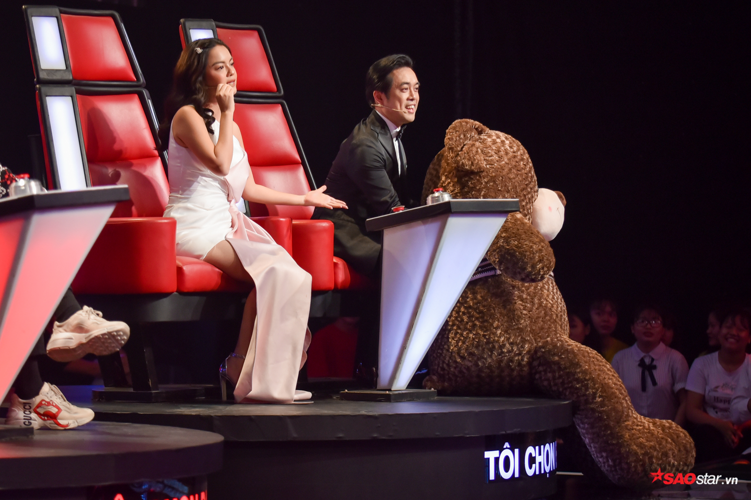 Ngoài vương miện, bộ đôi còn mang cả gấu bông, gấu mini các loại, chùm bong bóng khổng lồ và cả bình nước uống lên sân khấu Giấu mặt The Voice Kids 2019.
