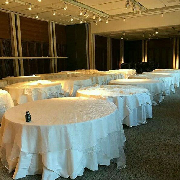 Trong phòng hội nghị, những bàn tiệc cũng đã được phủ khăn trắng. Có vẻ như màu sắc chủ đạo sẽ là màu trắng trang nhã.
