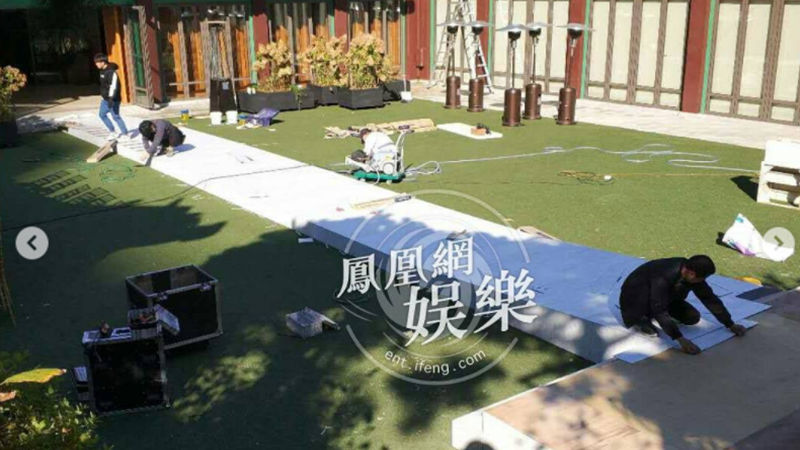 Có thể thấy các công nhân đang ghép các tấm ván gỗ trên mặt cỏ để tạo thành lối đi lên sân khấu.