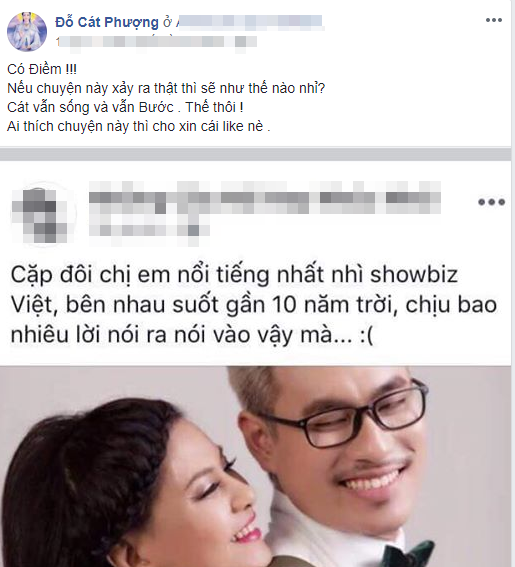 Thực hư câu chuyện vẫn chưa được chứng thực, thế nhưng mới đây dòng chia sẻ của nữ diễn viên Cát Phượng lại nhận được nhiều sự quan tâm từ phía người hâm mộ. Cát Phượng nói rằng “Có điềm! Nếu chuyện này xảy ra thật thì sẽ thế nào nhỉ? Cát vẫn sống và vẫn bước. Thế thôi”.