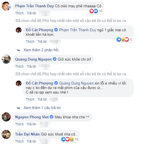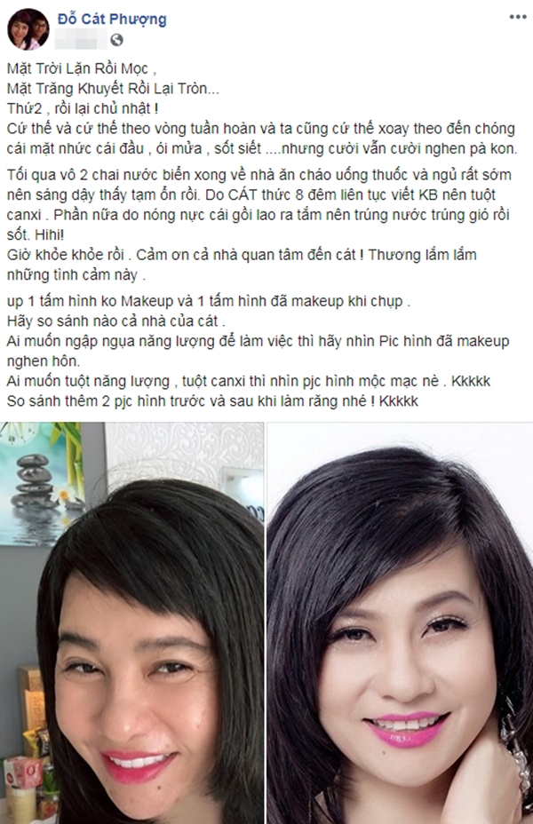 Nữ diễn viên gửi lời cám ơn đến sự quan tâm của mọi người đồng thời không quên hài hước chia sẻ hai tấm ảnh mặt mộc và đã qua make up của mình cùng lời bình: “Ai muốn ngập ngụa năng lượng để làm việc thì hãy nhìn hình đã makeup nghen hôn. Ai muốn tuột năng lượng, tuột canxi thì nhìn hình mộc mạc nè“. Có vẻ Cát Phượng đã lấy lại tinh thần sau sự cố về sức khỏe tối qua.