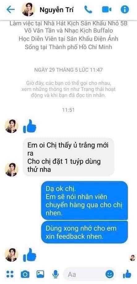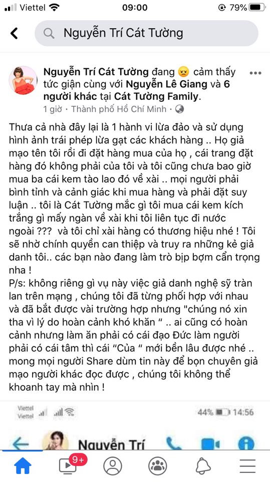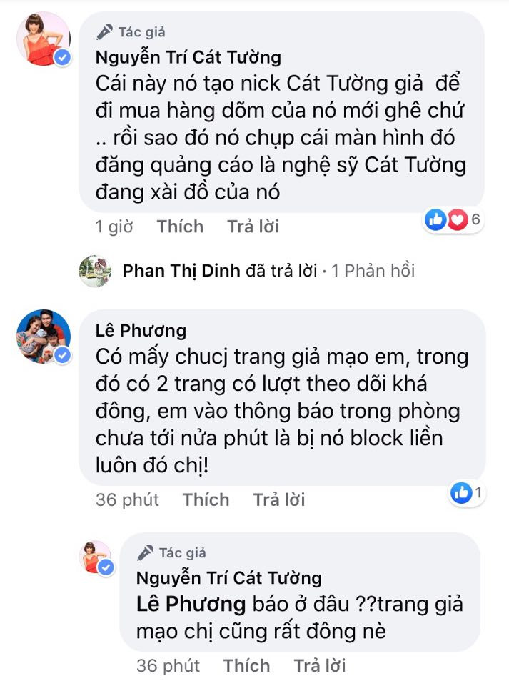 MC Cát Tường viết: “Thưa cả nhà đây lại là một hành vi lừa đảo và sử dụng hình ảnh trái phép lừa gạt các khách hàng… Họ giả mạo tên tôi rồi đi đặt hàng mua của họ, cái trang đặt hàng đó không phải của tôi và tôi cũng chưa bao giờ mua ba cái kem tào lao đó về xài, mọi người phải bình tĩnh và cảnh giác khi mua hàng và phải đặt suy luận. Tôi là Cát Tường mắc gì tôi mua cái kem kích trắng gì mấy ngàn về xài khi tôi liên tục đi nước ngoài và tôi chỉ xài hàng có thương hiệu nhé!”.